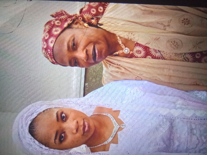 Two women are visible in the image. The woman on top wears a patterned headscarf and light-colored, patterned top with a necklace. Her expression is warm, with a slight smile. The woman below is in a white head covering and robe with intricate detailing, including a sparkly necklace. She is looking at the camera with a direct gaze. The overall scene feels intimate and possibly celebratory, given the dress and jewelry.