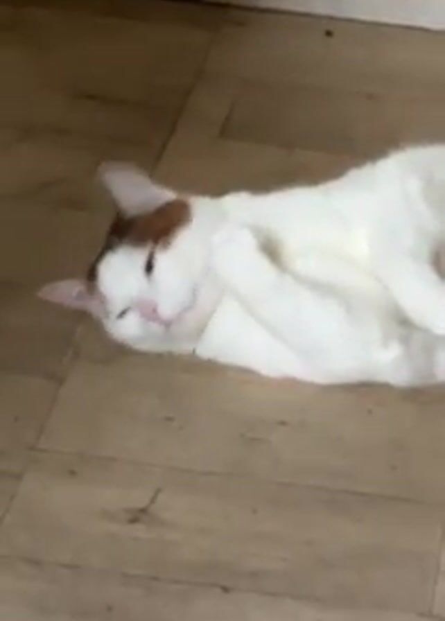 - "white cat with brown markings on its head lying on its side on a wood-look floor" by FM-9wXCm1, licensed under CC BY 4.0