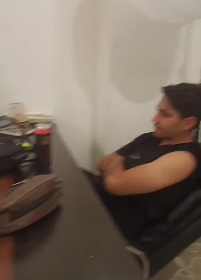 group of people gathered around a dark wood table in a room with white walls. The table is cluttered with various items including a computer monitor, keyboard, phone, cans of soda, packs of cigarettes, a small ashtray, and several bags. Two men are visible, one seated at the table and another walking towards it. The seated man is wearing a black shirt and the other man is wearing a red shirt under a black jacket. The overall impression is that of a casual, possibly relaxed environment.