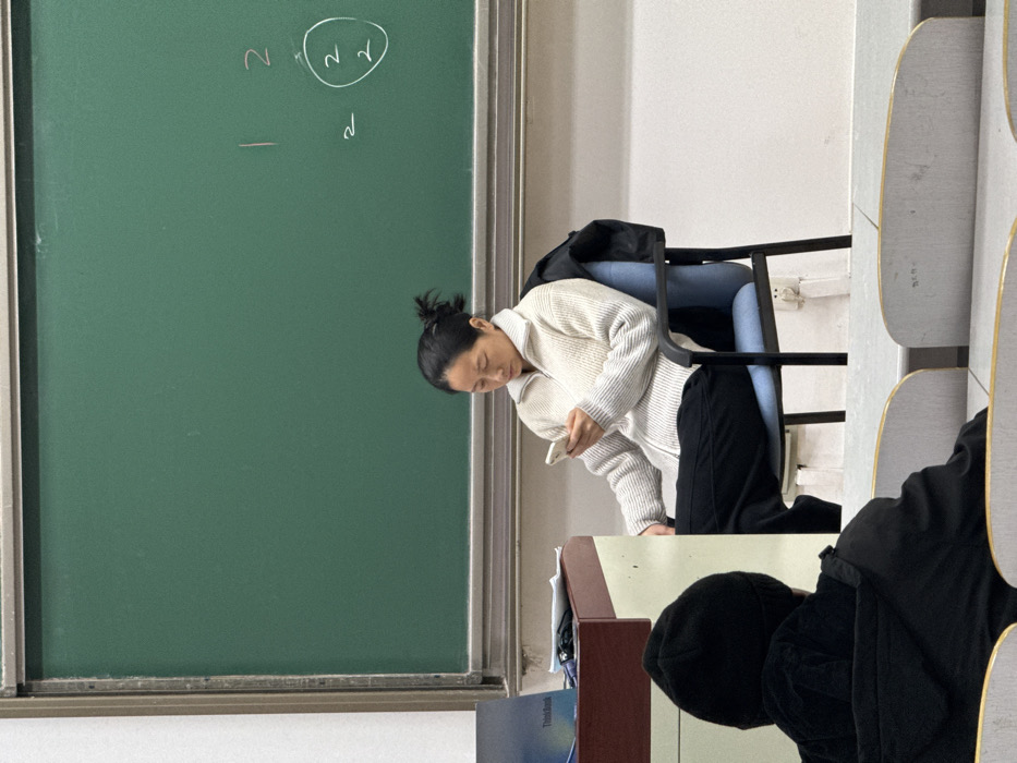 The image depicts an indoor classroom setting, likely within a school or university located in Daxing District, China. In the mid-ground, an adult East Asian female is seated in a light blue office chair. She has dark hair styled in a bun and wears a cream-colored, full-zip knit sweater and dark trousers. She is looking downwards, holding and interacting with a white smartphone with both hands. A black jacket is draped over the back of her chair. To her immediate left, a wooden podium or desk holds an open silver ThinkBook laptop and some papers. Behind the seated female, a large green chalkboard is visible, displaying handwritten white chalk markings including a '1', three instances of '2', and a circle enclosing two '2's. The walls are white. In the foreground, the back of a person wearing a black beanie and a black hooded garment is visible, seated at a light grey student desk, facing the front of the room. Additional light grey student desks are partially visible in the lower foreground.