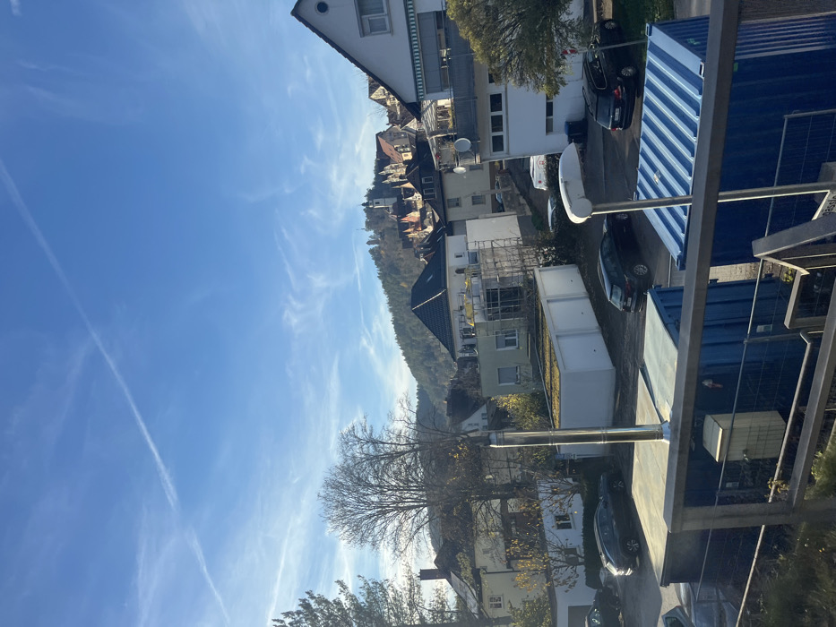 The image depicts an elevated, panoramic view of the city of Horb am Neckar, Germany, under clear, sunny conditions. The sky occupies the upper half, featuring a distinct blue hue with wispy cirrus clouds and a prominent 'X'-shaped contrail. In the immediate foreground, a metal railing, likely part of a balcony or an observation deck, crosses the lower right. Below this, two large, corrugated blue industrial containers are partially visible, one on the left and one on the right. A small, light-colored utility structure with a flat roof and a vertical cylindrical metal chimney pipe is positioned in front of the left blue container. A dark-colored SUV or wagon is parked on a dirt or gravel surface behind these structures in the lower-left. A white street light with a curved arm and an elongated housing is visible in the lower-center-right. The mid-ground features a residential area with various houses. Architectural styles vary, but common elements include dark tiled roofs and light-colored facades (white, beige, light green). One building in the center-right is enveloped in scaffolding, indicating construction or renovation. Several vehicles, including a dark station wagon on the right and another dark car on the left, are parked on unpaved areas. Flat-roofed garage or storage structures with vegetated (green) roofs are also present. Deciduous trees, mostly bare or with sparse yellow-brown foliage, and some evergreen trees are scattered throughout this section. In the background, a densely forested hill rises, its slopes covered in trees. On the crest of this hill, the historic core of Horb am Neckar is visible, characterized by a cluster of traditional buildings with red-brown tiled roofs and a prominent church with a white spire. No individuals are discernible within the frame, and no specific actions or interactions are depicted.