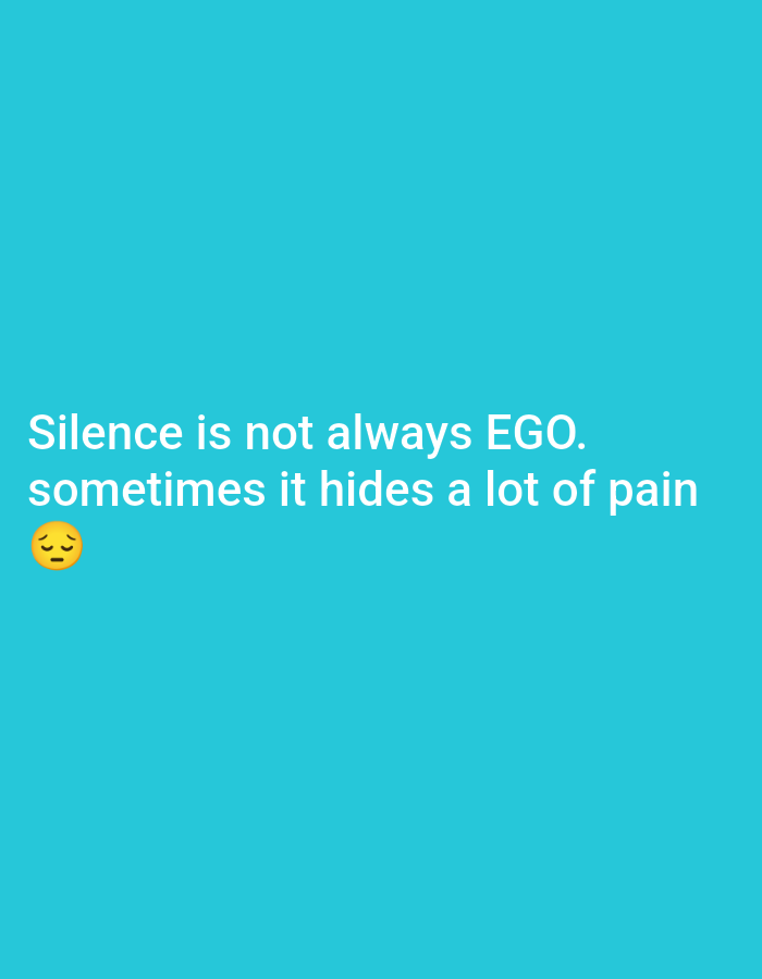 An image, located in the city of Zawan, Nigeria, presents white sans-serif text against a solid turquoise background. The text reads: "Silence is not always EGO. sometimes it hides a lot of pain". A yellow sad face emoji (😔) is positioned immediately to the left of the word "sometimes" on the second line. No individuals, discernible actions, or interactions are depicted within the scene.