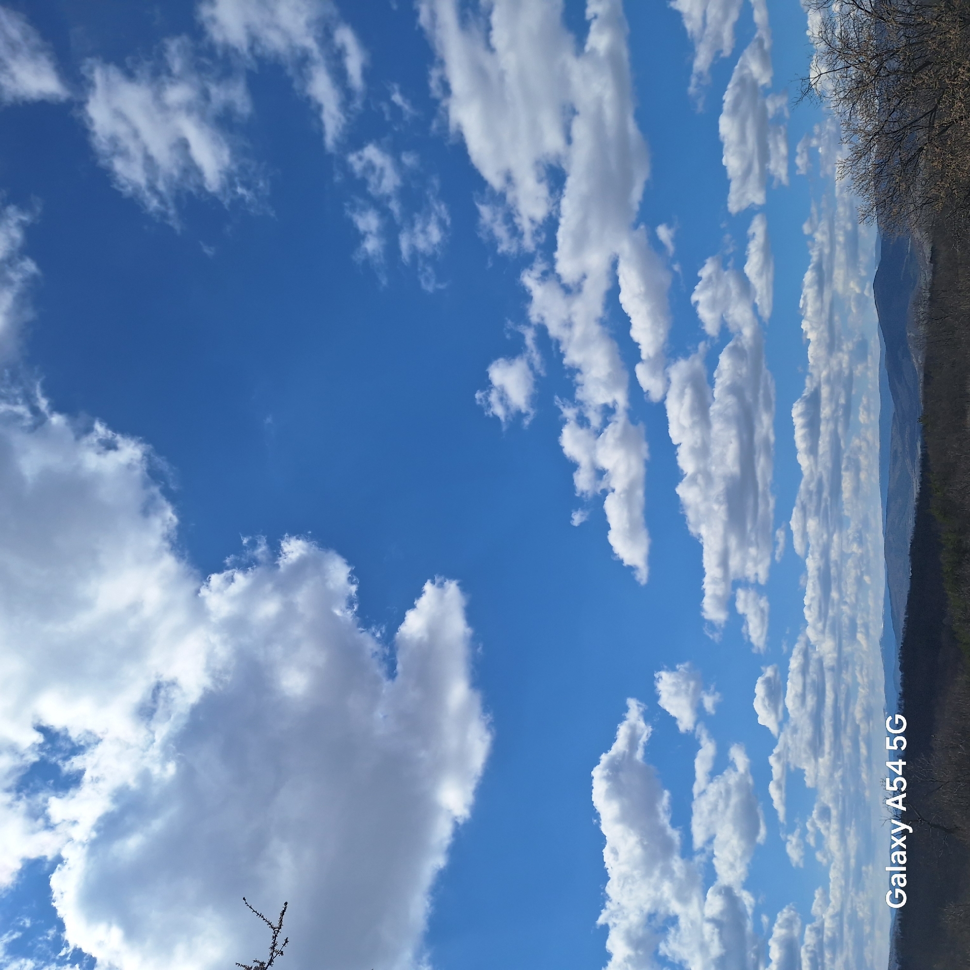 daytime sky with many small, puffy white clouds. There is a clear blue sky visible between the clouds. In the distance, there is a mountain range and a tree. The photograph appears to have been taken in Gigintsi, Bulgaria, based on the camera's labeling. The photo includes "Galaxy A54 5G" written on the side.