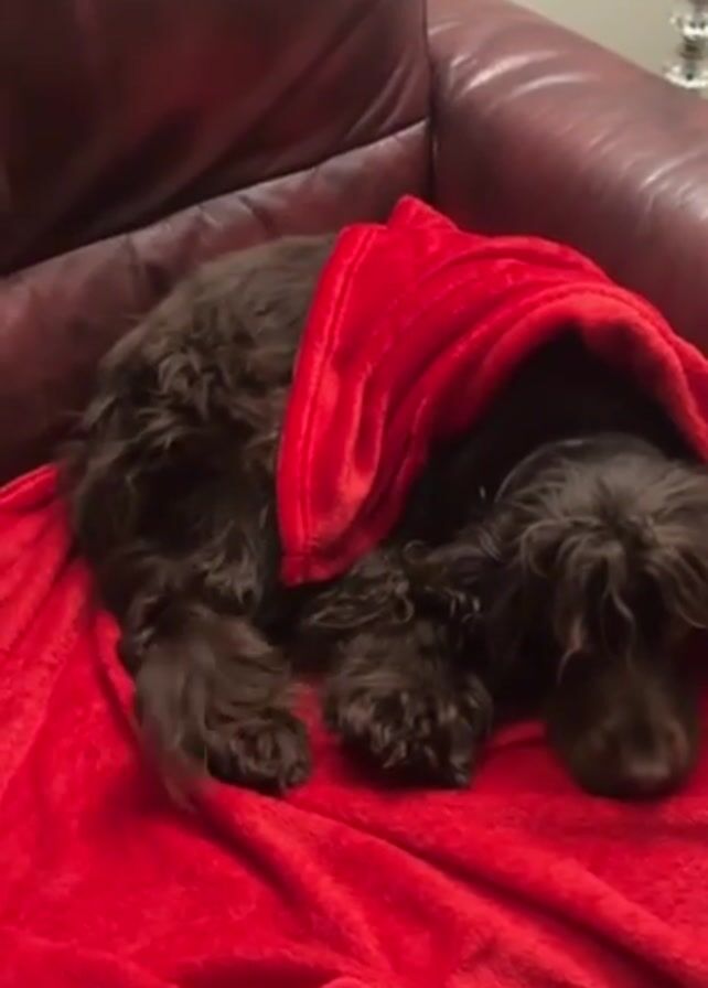 A brown cocker spaniel rests on a red blanket that's draped over it, on a brown leather couch.