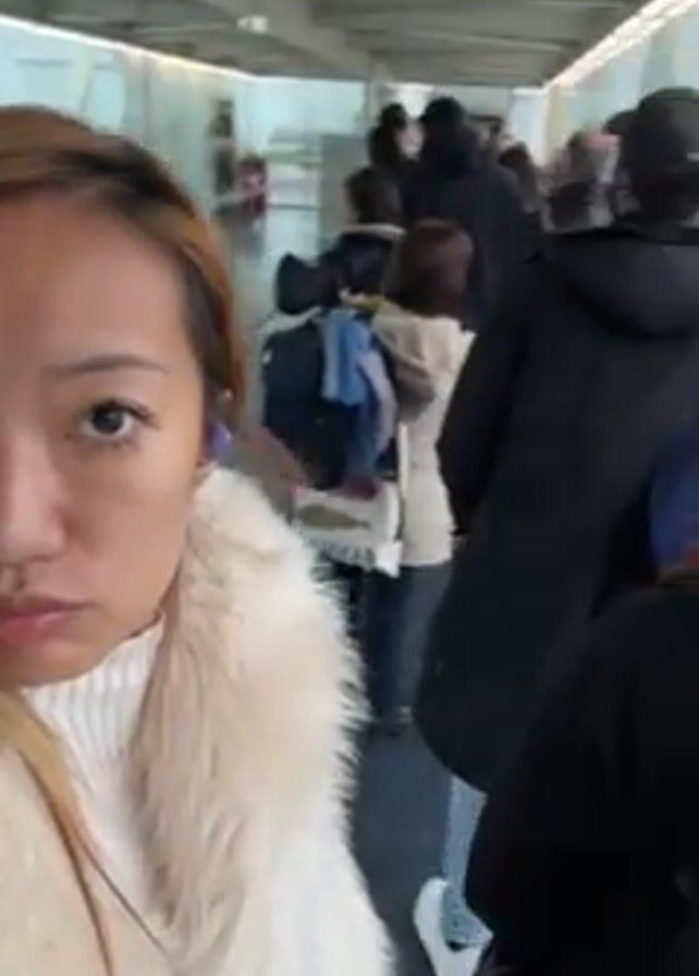 A woman with light brown hair and a white fur-trimmed coat is filming herself as she walks down a crowded airport corridor. The corridor has windows on the right side, and she is following a line of people. She appears to be looking directly at the camera.
