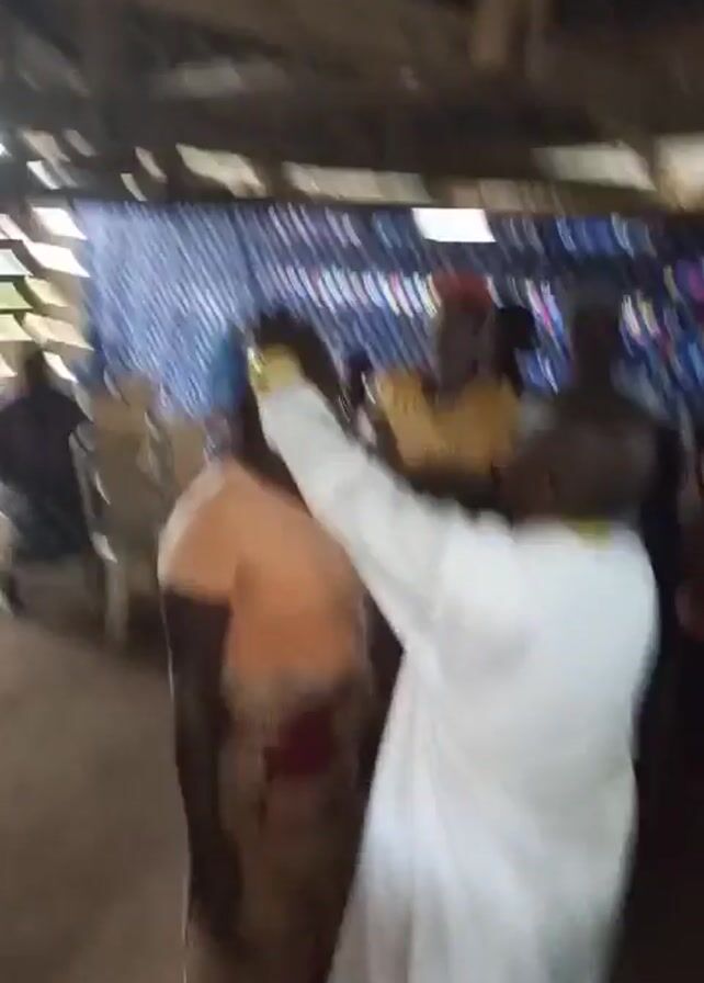 Inside a rustic building with a corrugated metal roof and exposed wooden beams, a man in a white robe is shown spraying a woman's face with a small spray bottle
