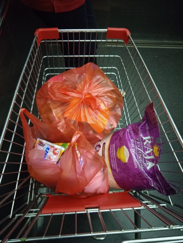 A shopping cart holds several grocery items. A large, orange plastic bag filled with goods sits in the center. To its left are two smaller red plastic bags containing groceries. On the right is a purple Raja Platinum rice bag. The cart's metal frame and red handle are visible.