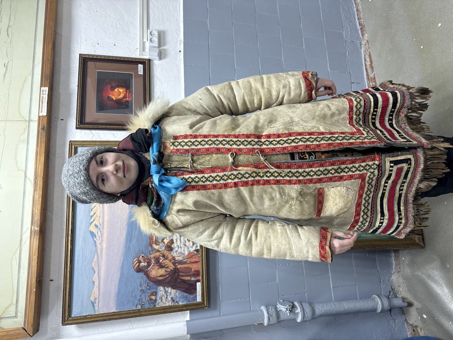 A person wearing a traditional fur coat with decorative trim and fringe stands in front of a gray wall