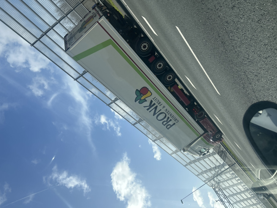 - "A semi-trailer truck, identifiable as "PRONK GROENTEN & FRUIT" by its branding and logo featuring an apple and pear, is depicted traveling on a multi-lane asphalt highway under a partly cloudy blue sky" by FM-DLbUk2, licensed under CC BY 4.0
