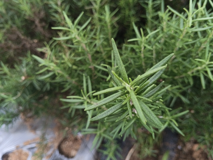 A close-up, high-angle photograph depicts the green foliage of a plant identified as rosemary (Rosmarinus officinalis). The central focus is on a cluster of sharply defined, narrow, elongated, green leaves radiating from a central stem. The leaves exhibit textured surfaces. The background consists of additional, out-of-focus green leaves and branches belonging to the same plant. Below the main foliage, indistinct brown areas are visible, consistent with soil or a planting medium. A blurry, light-colored object, possibly a white plastic sheet or container, is partially present in the bottom-left corner of the frame. No individuals are depicted, nor are any actions or interactions. The image lacks specific architectural, urban, or geographical features to determine a precise location within Ho Chi Minh City, Vietnam, beyond indicating a cultivated plant environment.