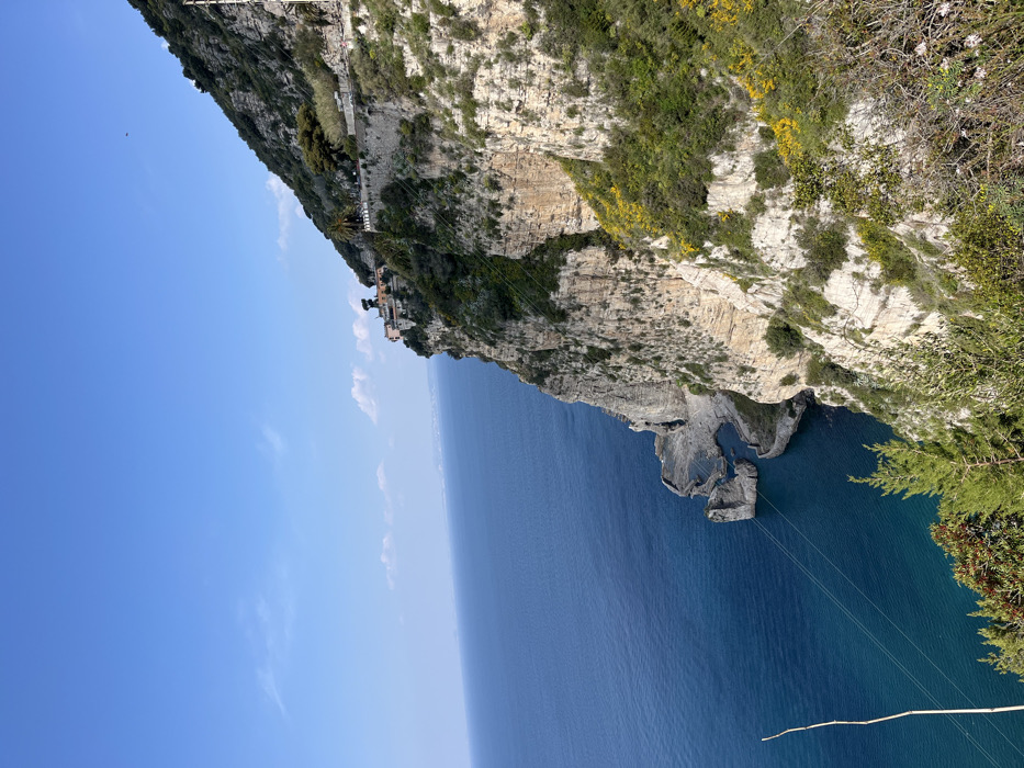- "This image depicts a coastal panorama in Meta, Italy, characterized by a prominent, steep limestone cliff face descending into the deep blue Tyrrhenian Sea under a clear blue sky with sparse white clouds" by FM-X3uic2, licensed under CC BY 4.0