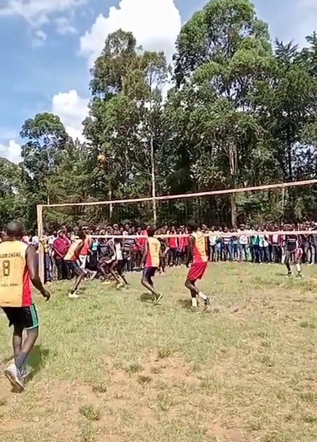 volleyball game in progress on a grassy field, with a net separating two teams of young men wearing athletic uniforms