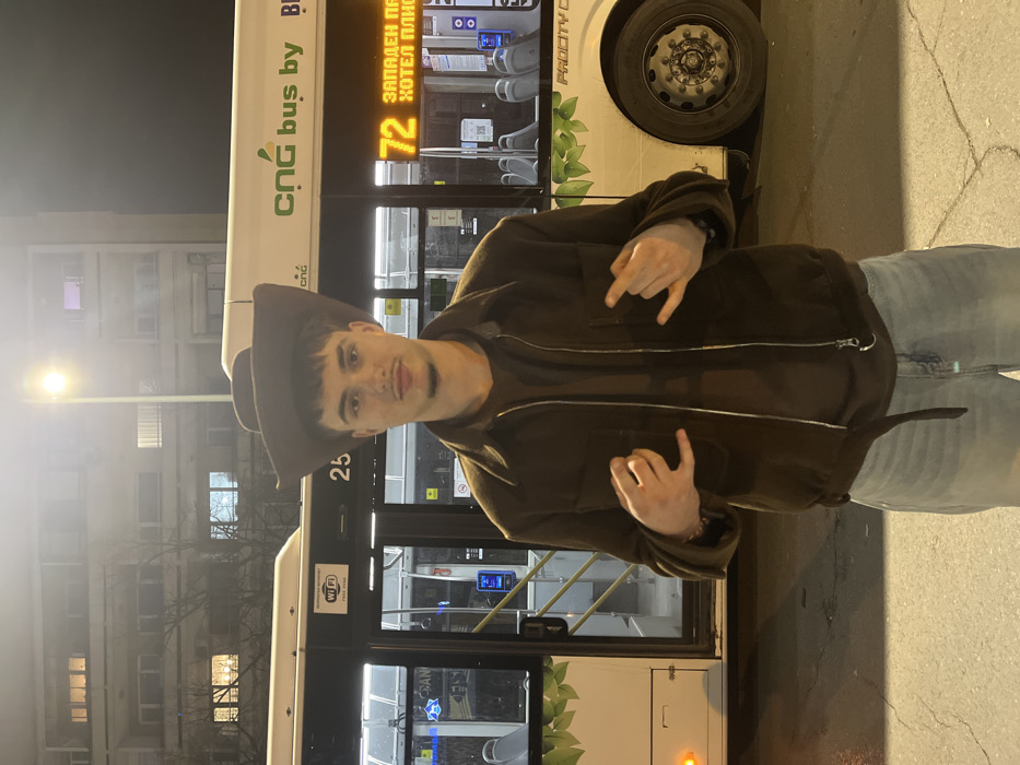 A young male individual, wearing a dark brown cowboy hat, a dark brown zippered jacket over a dark brown t-shirt, and light blue jeans, stands facing forward on an asphalt surface at night. He holds both hands up to chest level, performing "rock on" gestures. His expression is neutral as he looks directly at the camera. Behind him, a white public transport bus is partially visible, displaying "CNG bus by" and "PROCITY CNG" branding. A digital sign on the bus shows "72" in yellow, followed by Cyrillic text reading "ЗАПАДЕН ПАРК ХОТЕЛ ПЛИСК" (WESTERN PARK HOTEL PLISKA), indicating its route and destination. A "Wi-Fi" logo and the number "25" are also present on the bus exterior. The bus interior shows empty seats. In the background, a multi-story building with illuminated windows is visible against a dark sky, and bare tree branches are discernible. A bright streetlamp is situated behind the individual. The presence of a bus route ending at "Hotel Pliska" firmly places the scene within the city of Sofia, Bulgaria, likely at a bus stop or along a route leading to the Hotel Pliska landmark. The environment is an urban setting, illuminated by artificial light sources.