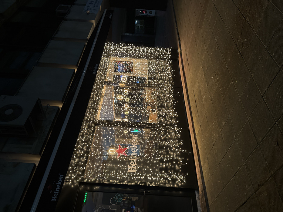 The image displays the illuminated storefront of a commercial establishment at night, located in the city of Kyustendil, Bulgaria. The entire glass facade, including multiple display windows and an entrance door on the left, is covered by a dense arrangement of small, warm-white decorative lights. A large "Heineken" logo, featuring its red star, is visible on the glass through the lights. A dark awning extends above the storefront, also bearing the "Heineken" brand name. Faint text on the door indicates "OTVORENO 08.00" (OPEN 08.00). The interior, visible through the lit windows, is indistinct. Above the awning, the building's dark upper facade includes several external air conditioning units. The foreground consists of a paved sidewalk composed of square concrete tiles, illuminated by the light emanating from the storefront. To the far right, a partially visible sign reads "SK. DLG." No individuals are present, and no actions or interactions are depicted. The environment is an urban commercial setting, characterized by artificial nighttime illumination.