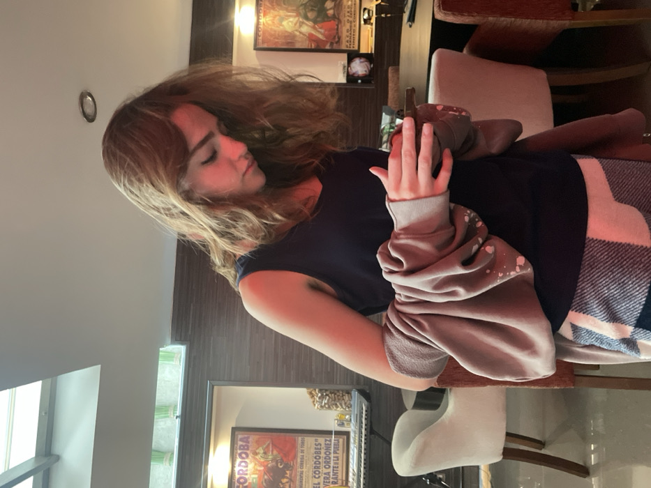 A woman with wavy brown hair looks down at something in her hands, focusing intently. She wears a navy blue sleeveless shirt with a beige, paint-splattered sweatshirt sleeve over one arm. A plaid blanket is draped nearby. The setting is indoors, with dining chairs and tables visible, along with framed posters on the wall behind her. A window lets in natural light.