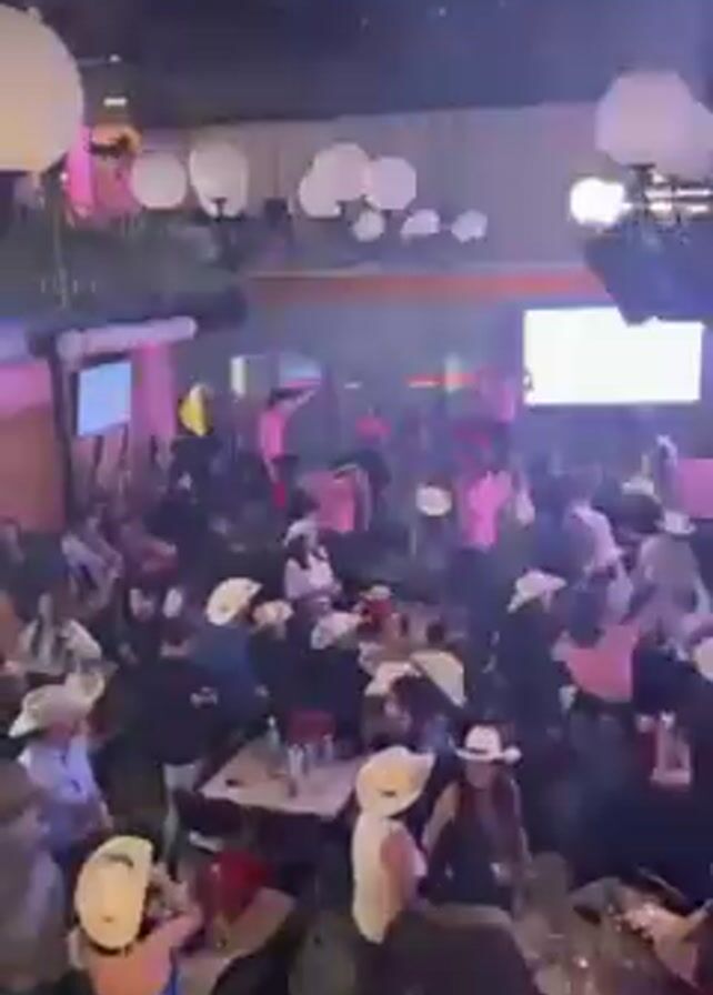 crowded, dimly lit interior space, possibly a bar or restaurant, where many people are standing, dancing, and moving around. The majority of the individuals in the crowd are wearing white cowboy hats. There are tables and chairs scattered throughout the area, and some tables have drinks and other items on them. A few people near the front of the crowd are wearing pink shirts. A raised platform or balcony can be seen at the back of the room, and there are decorative lights hanging from the ceiling. A large screen is visible on the wall. A significant amount of particulate is flying throughout the air. The overall impression is of a lively and energetic gathering.