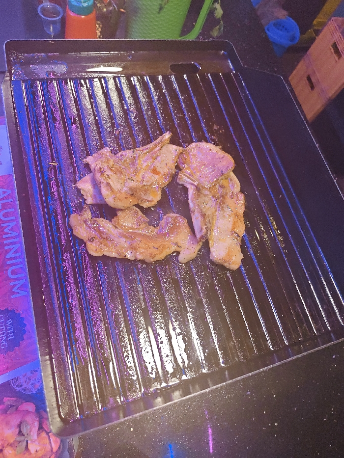 Four cooked lamb chops rest on a black grill. The chops have a seasoned, browned surface. The grill's surface is shiny, reflecting light, and has a ridged pattern. The background shows blurred objects, including containers and a wooden structure. The overall lighting is dim, with a blue and purple hue emphasizing the grill and meat.