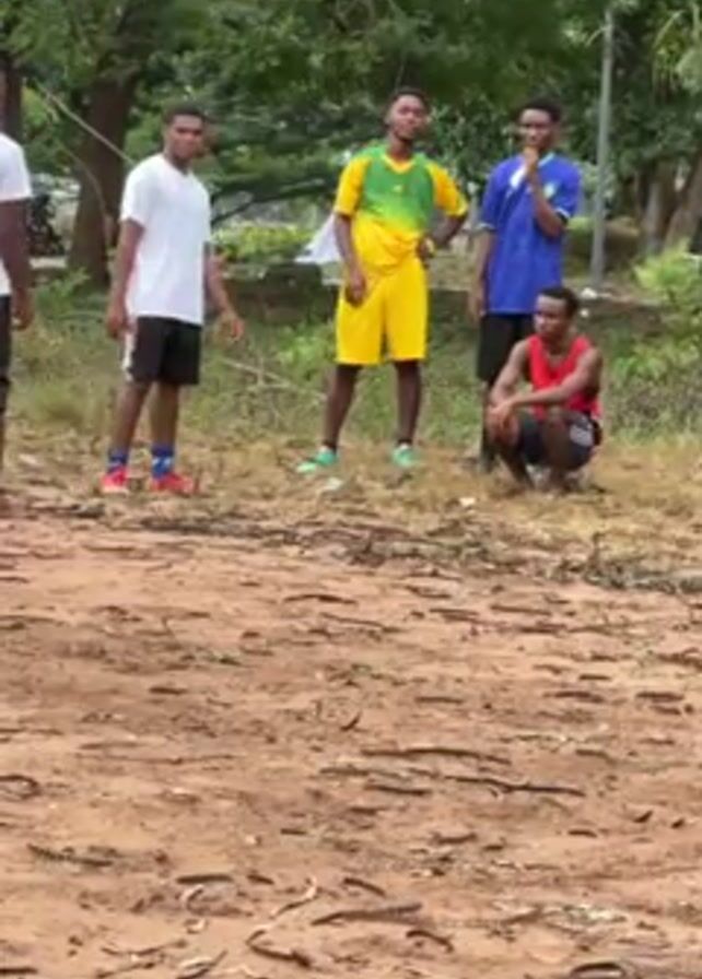 six young men standing in a semi-circle on a patch of muddy ground beneath some trees, apparently in a park