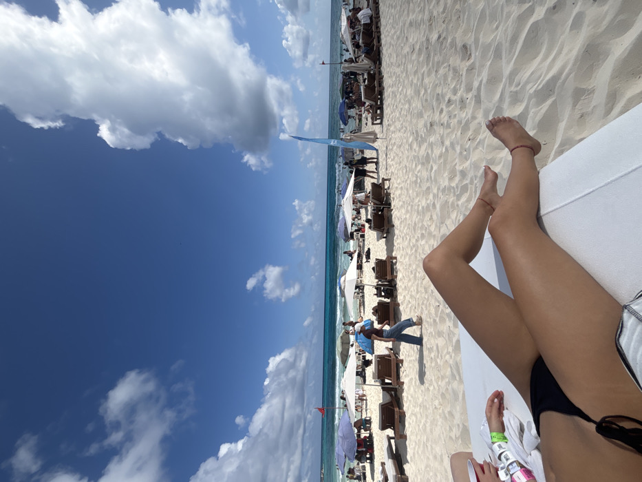 The image depicts a crowded beach scene in Cancún, Mexico, from a first-person perspective. In the immediate foreground, the tan legs and lower torso of an individual are visible, reclining on a white padded lounge chair. The individual wears a black bikini bottom, and a white wristband with green text is visible on the left wrist near a red plastic cup. Red string anklets adorn both ankles. The mid-ground reveals a wide expanse of white sandy beach, populated with numerous dark wooden lounge chairs and white or light-colored beach umbrellas, arranged in rows. Multiple individuals are seated or lying on these chairs. One person, wearing blue jeans and a dark top, is observed walking from left to right across the sand in the central mid-ground. Towards the right, a tall, vertical blue banner with white lettering is planted in the sand. In the background, the turquoise waters of the ocean exhibit small waves, and a red flag is visible planted near the shoreline on the left, indicating potential water conditions. Many people are seen wading or swimming in the ocean. The sky above is clear blue with scattered white cumulus clouds, suggesting fair weather. The overall scene is brightly lit by natural sunlight.