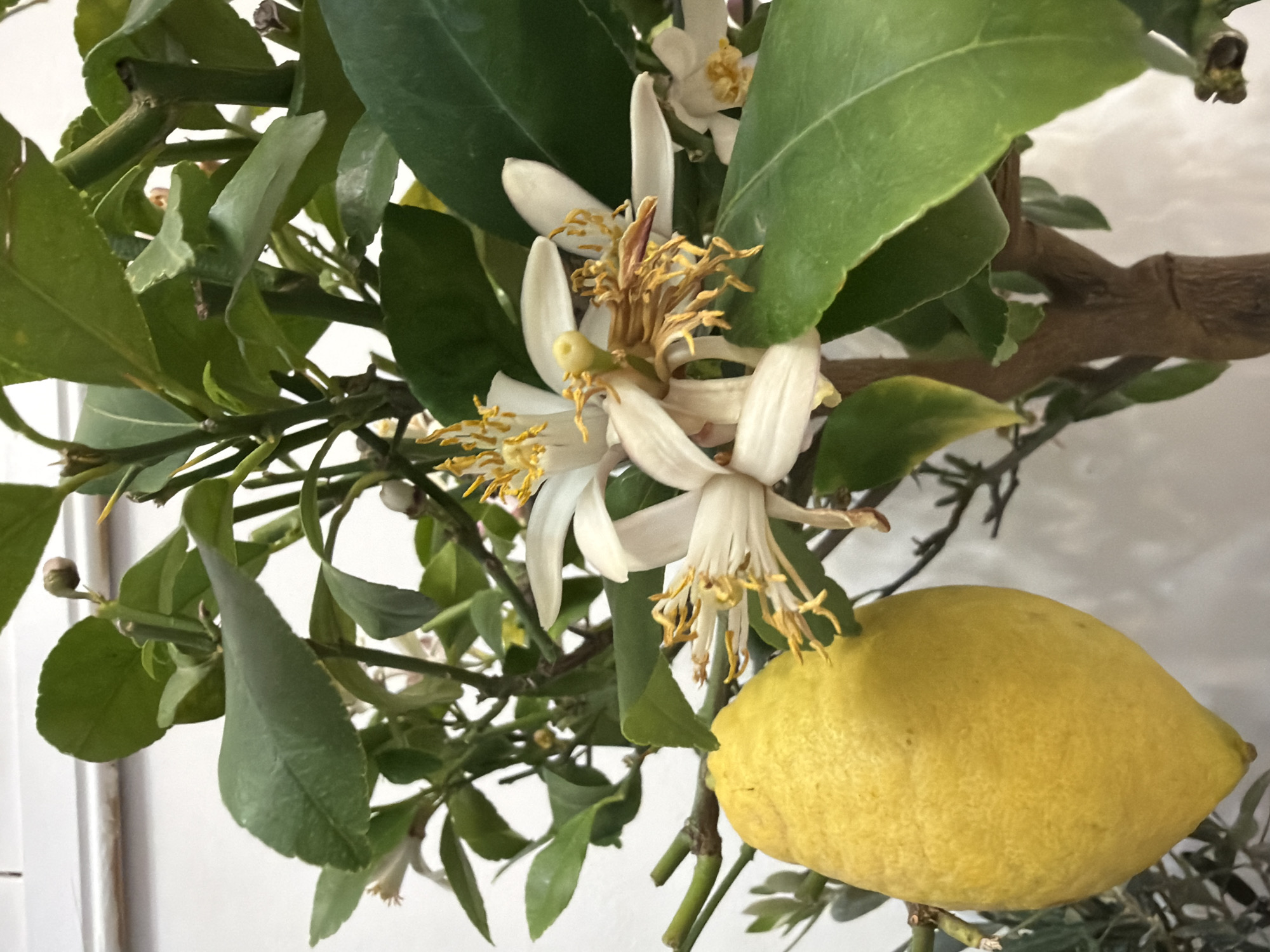 - "The image features a branch of a lemon tree bearing a mature yellow lemon, several green leaves, and white lemon blossoms with yellow stamens" by FM-7ke6B2, licensed under CC BY 4.0