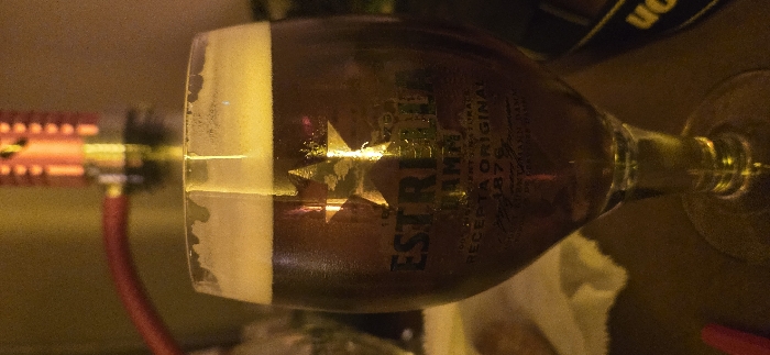 A tilted glass of amber beer, likely Estrela Damm due to visible branding, sits with a foamy head. The glass stem and base are evident, and a partial camera is visible in the background. A red hose and metallic component intrude on the left side of the frame. Lighting appears dim and warm. The beer label includes a star. The image is slightly rotated counter-clockwise.