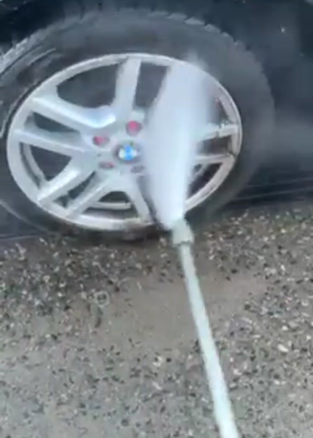 A pressure washer is used to spray the wheel of a car