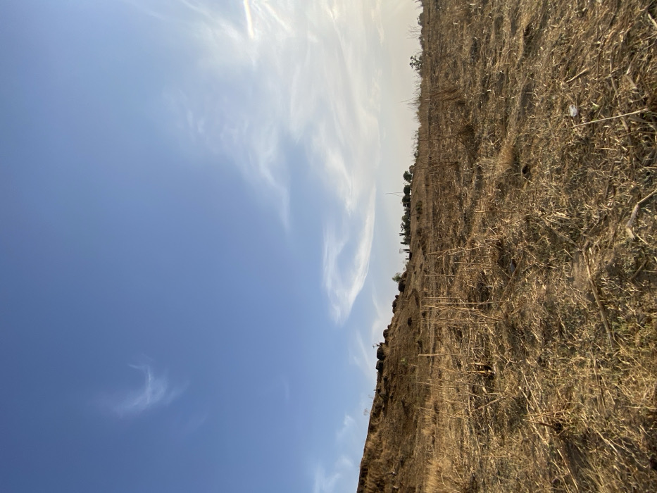 A landscape depicts a clear blue sky with wispy white clouds taking up roughly half the frame. Below, dry, golden grass covers a hillside, dotted with small bushes and trees along the horizon. The terrain appears arid, with scattered debris. The angle provides a unique perspective, where the sky dominates the left side, contrasting with the earth on the right.