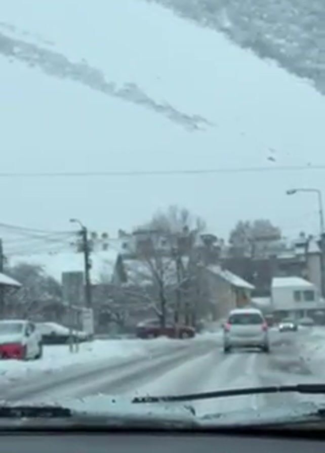 first-person perspective of driving on a snowy street in a residential area. Snow covers the windshield of the car, with some visibility through the cleared portion. There are houses and trees covered in snow on either side of the road. Other cars are visible on the road, including a silver car ahead and a red car parked on the side. Power lines and street lights are also visible.