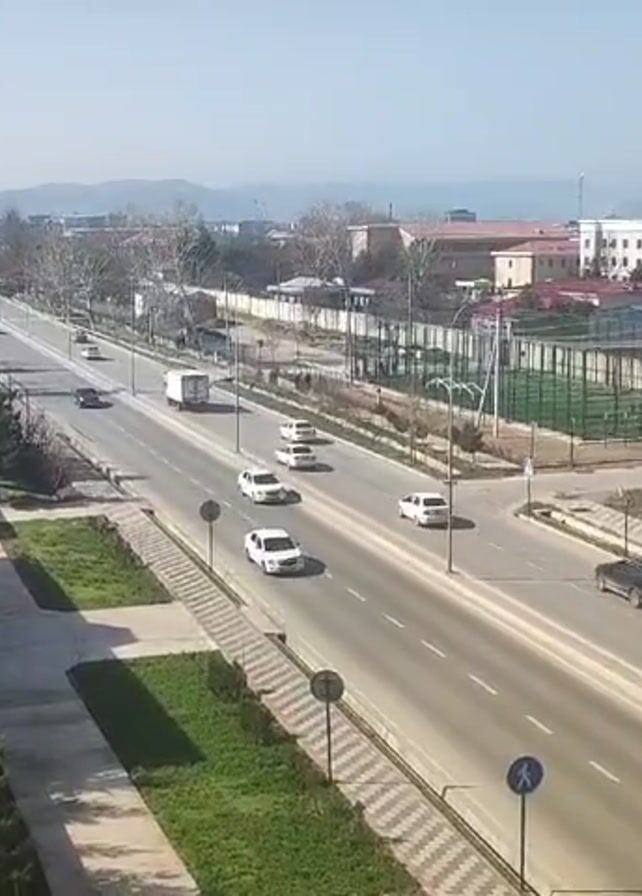 A high-angle, medium shot depicts a street in an urban area. The street has multiple lanes of traffic with cars driving in both directions. There is a sidewalk on the left side of the street, with patches of grass and small trees separating the sidewalk from the street. On the right side of the street, there is a fenced-in sports field or court. Buildings, including houses and larger structures, line both sides of the street. In the distance, there are mountains. The sky is clear and blue. Several people can be seen walking on the sidewalk. The scene appears to be taken during the day.
