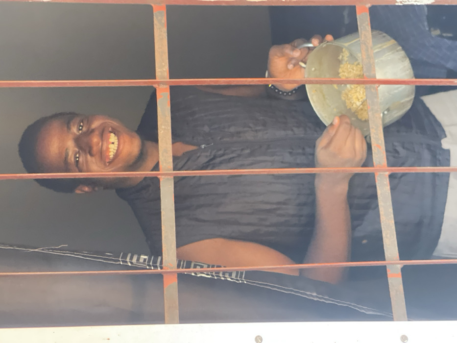 An individual is depicted from the chest up, positioned behind a weathered, red-orange metal window grill, consistent with a residential or commercial building in Uturu, Nigeria. The subject is a male with dark skin, short dark hair, and a wide, open-mouthed smile displaying a prominent diastema (gap) between his upper central incisors. He is wearing a dark, possibly sleeveless or short-sleeved, zippered top and light-colored lower garments, partially visible. A black beaded bracelet is on his left wrist. The individual holds a silver-colored pot containing cooked, light-colored food (likely rice or noodles) in his left hand, while his right hand holds a spoon, apparently consuming food directly from the pot. He is looking directly forward, engaging with the camera. The background behind the subject is dark, suggesting an indoor setting with limited illumination, contrasting with the brighter light source illuminating the subject and the grill from the foreground. A piece of patterned fabric or strap hangs vertically on the left side, partially obscured by the grill.