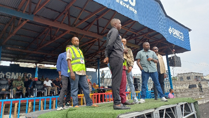 The image depicts an outdoor event taking place in Goma, Democratic Republic of the Congo, beneath a large, blue corrugated metal canopy