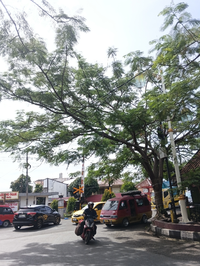 A street scene unfolds under a large, leafy tree. Cars, including a red van and a black SUV, are parked alongside the road. A motorcyclist wearing a yellow shirt rides towards the camera. A railroad crossing gate is visible in the background. A tall, decorative light pole stands among the trees. Buildings and signage are seen in the distance, adding depth to the urban landscape.