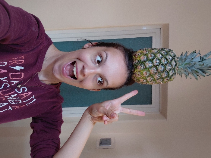 An indoor photograph captures a female subject from the chest up, positioned against a light-colored wall. A whole pineapple, featuring a green leafy crown and a textured greenish-yellow body, is balanced centrally on her head. The subject, a woman with dark hair styled away from her face, exhibits a wide-eyed expression with her gaze directed upwards and to the right. Her mouth is open in an exaggerated manner, revealing her teeth and tongue. Her left hand is raised to head level, forming a "V" sign with her index and middle fingers extended. She wears a maroon long-sleeved shirt with partial white lettering, reading "FRIDAY SATURDAY SUNDAY," and a thin necklace with a small dark pendant. In the background, a white-trimmed door frame is visible, revealing a dark teal or green surface beyond. To the right, a grey wall-mounted light switch or electrical outlet is present. The specific city location of Nova Zagora, Bulgaria, cannot be determined from the visual information contained within this image.