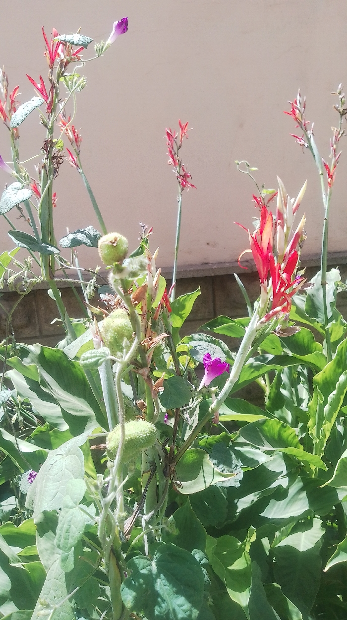 The scene displays a dense arrangement of flowering and fruiting plants in an outdoor garden environment, illuminated by direct sunlight. Dominant features include multiple upright stalks bearing reddish-orange Canna lily flowers and buds, alongside broad, verdant leaves. A climbing plant with several spiky, light-green, ovoid fruits, consistent with a type of wild gourd, is present in the mid-left. Scattered among the foliage are purple, bell-shaped flowers, indicative of Morning Glory species. The immediate background comprises a light-colored, plain wall or building facade in the upper section, with a lower segment revealing a grey stone or concrete block wall. No individuals or animals are present. This location is identified as a garden within Nairobi, Kenya.
