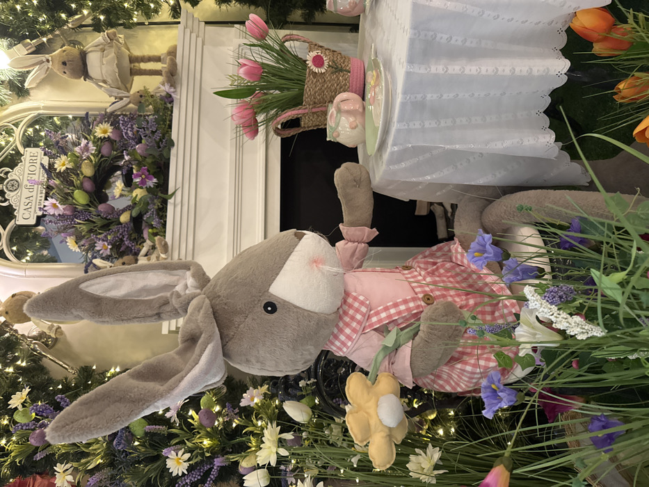 The scene is an indoor seasonal display, likely Easter-themed, located at the Casa di Fiore Spa & Medical Hotel in Kranevo, Bulgaria. In the foreground, a large, grey-brown plush bunny, dressed in a pink gingham overall dress with wooden buttons over a light pink long-sleeved shirt, is seated amidst artificial green grass and various artificial flowers, including purple, white, and orange tulips. The bunny holds a yellow felt flower with a green stem in its left hand, while its right arm is extended towards a small, round table. The table, covered with a white tablecloth featuring embossed vertical stripes and a scalloped, eyelet lace hem, holds a light green saucer and a white teacup adorned with bunny ears and pink accents. A second similar teacup or pot is partially visible behind the first. To the left of these items, a straw basket containing artificial pink tulips and green leaves is present, embellished with a small white and pink daisy. In the background, a white fireplace mantel with a dark, recessed firebox supports an arched mirror. A decorative sign affixed to the mirror reads "CASA DI FIORE SPA & MEDICAL HOTEL". The mantelpiece is adorned with a large wreath composed of artificial lavender, white daisies, green foliage, and pastel-colored Easter eggs. Two additional smaller plush bunnies are displayed on the mantel: one standing upright to the right of the wreath, dressed in a beige outfit, and another smaller bunny seated to the left. Artificial green foliage garlands with integrated string lights frame the overall display on both sides.