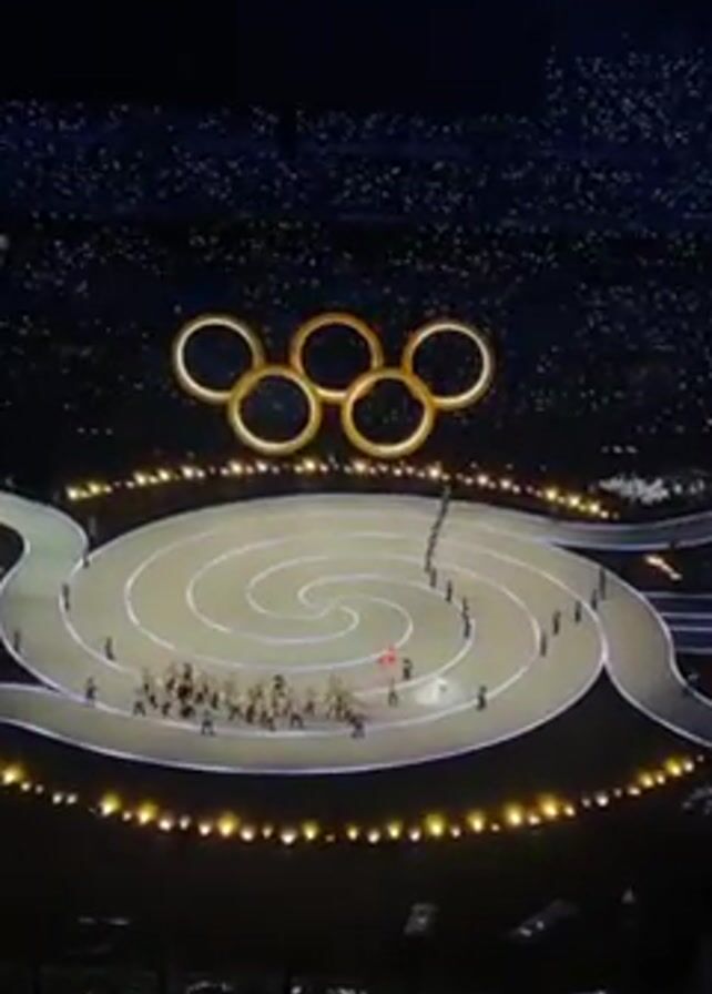 high-angle view of a large stadium lit up with artificial lights. On a circular stage with a spiral design, performers are moving, some carrying flags. Above the stage are large, illuminated Olympic rings. The surrounding stadium seats are filled with people, adding to the spectacle of what appears to be a large-scale event or ceremony. The camera is stationary and presumably handheld, capturing the scene from the audience's perspective.