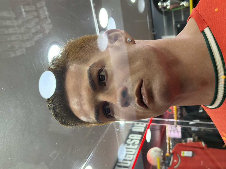 A sideways close-up shot showcases a wax figure of a man with light brown hair, dark eyes, and a small earring. The figure wears a red shirt with a green and white striped collar. The image is taken through glass, reflecting overhead lights. Below the figure, blurred words, possibly "FUGUESA DE," are visible, along with a small soccer ball and other objects, suggesting a display case. The overall impression is that of a museum exhibit.