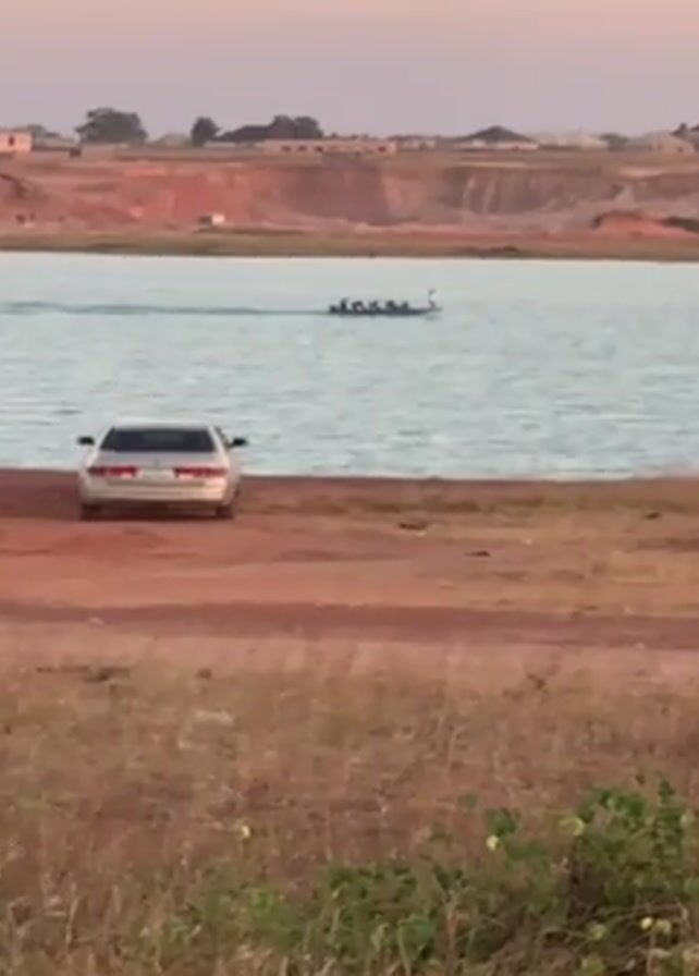 A static, distant shot captures a tranquil scene: a calm, blue lake with a long, white boat carrying several individuals who appear to be paddling. The boat is in the middle of the lake and leaves a white wake behind it. The lake is surrounded by red soil banks, suggesting an area with substantial excavation. In the foreground, a silver car is parked on the reddish-brown earth near the water's edge. The landscape is sparsely covered with dry grass and a few green shrubs. Distant buildings and trees dot the horizon under a soft, pinkish-grey sky, hinting at either sunrise or sunset. The overall impression is one of quiet activity in a somewhat barren but scenic location.