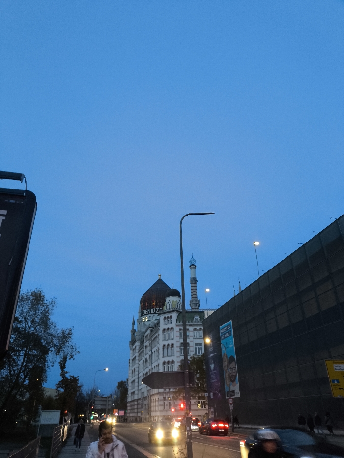 The image depicts an urban street scene at twilight in Dresden, Germany, centered on the historic Yenidze building. The Yenidze building, a former cigarette factory resembling a mosque, is a multi-story structure with a distinctive dark dome and several ornate minaret-like towers. The word "YENIDZE" is visible in white lettering on the building's facade below the dome. In the midground, a paved road carries vehicular traffic. Multiple cars with illuminated headlights and taillights are visible, some blurred by motion. A prominent street lamp with a curved arm stands in the mid-right. To the right of the road, a modern, dark-paneled building or structure rises. An advertising banner featuring a male face is visible on a pole in front of this darker structure. A yellow street sign is partially visible on the far right. On the left side of the road, a sidewalk is bordered by trees and a dark, low-lying barrier. Several pedestrians are walking on this sidewalk. In the immediate foreground, a person wearing a light-colored hooded jacket is walking on the sidewalk, looking down at a mobile phone held in their hands. A large, dark rectangular sign is partially visible in the extreme left foreground. The sky above is a deep, clear blue, indicative of dusk or early evening, with various artificial lights illuminating the scene.