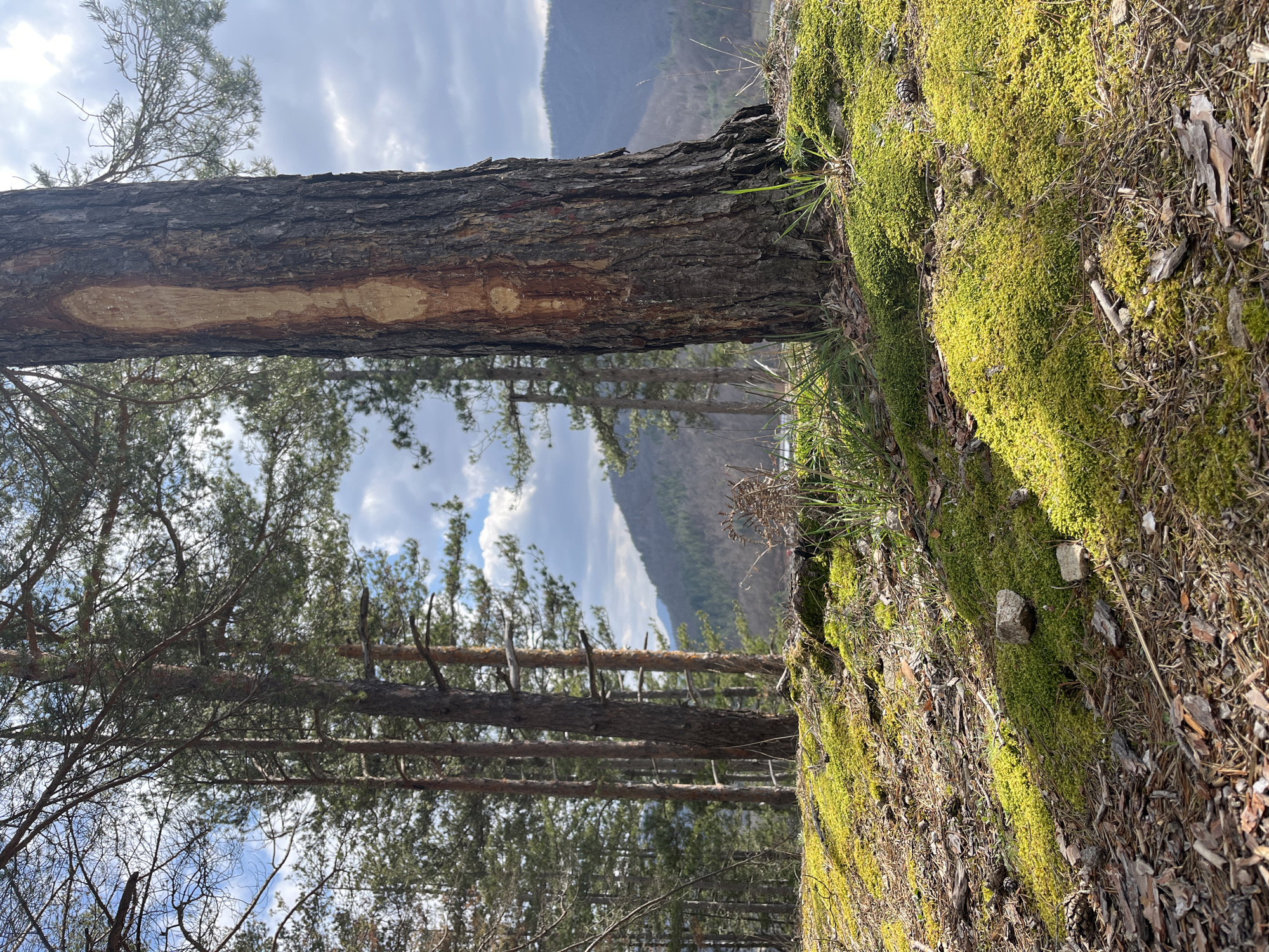 This image displays a natural outdoor scene within a pine forest near Lovtsi, Bulgaria. The foreground is dominated by the base of a large pine tree trunk on the right, exhibiting dark, textured bark with a significant vertical area of lighter, stripped wood on its left side. The ground surrounding the tree and extending across the lower half of the frame is primarily covered by a dense, vibrant green moss, interspersed with pine needles, small rocks, and dry plant debris. Patches of sunlight illuminate the moss, creating contrasting shadows. In the midground, a stand of tall, slender pine trees with dark trunks and green foliage rises. The background features distant, tree-covered hills or mountains beneath a partly cloudy sky with visible blue sections. No human subjects, animals, or specific actions are depicted.