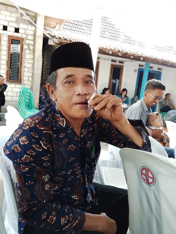 The image portrays an outdoor social gathering in Juwana, Indonesia, under bright daylight conditions. In the foreground, an adult male, appearing middle-aged or elderly, is seated. He wears a black peci and a long-sleeved dark blue batik shirt with brown and white patterns. He holds a lit cigarette to his mouth with his right hand, looking directly towards the viewer. A green pen is clipped into his left shirt pocket. He is seated on a white chair. To the immediate right, a portion of another white chair with a white fabric cover displays a circular red and white logo with an 'AB' monogram. In the mid-ground, a man with short hair and glasses is seen smiling while holding an infant wearing a light brown cap. Further back, multiple individuals, including other men and women (one in a blue top), are visible, seated on white chairs. A light green plastic chair is also present on the left side of the mid-ground. The background features a building with a terracotta tiled roof, white walls, and windows, some with blue frames. A partially constructed brick wall with an exposed window is visible on the far left. An overhead white canopy structure provides shade to the gathering area.