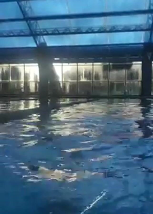 view from inside a swimming pool. The pool is indoors, as evidenced by a transparent, blue-tinted roof with visible structural supports. Large windows run along one side of the pool. There appear to be chairs or other furniture visible beyond the windows. The water in the pool is blue and rippling. A small splash is observed, indicating movement in the water.