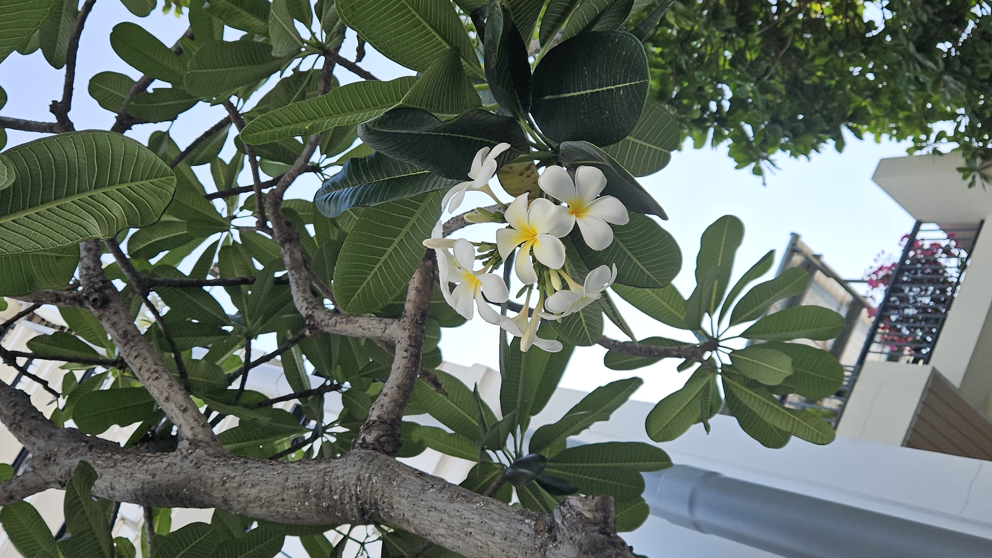 The image depicts a close-up, low-angle view of a Frangipani tree (Plumeria) in bloom