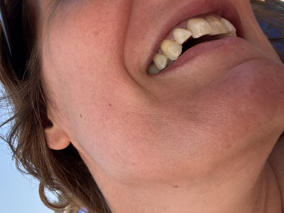 The image presents an extreme close-up of the right side of a human face, located in Sinquerim, India. The skin exhibits a reddish coloration, consistent with sun exposure. Brown hair is visible along the upper edge of the frame, partially obscuring the superior aspect of the right ear. The mouth is open, revealing a portion of the upper and lower teeth, which appear off-white to yellowish. The background in the upper left quadrant consists of a light blue expanse, consistent with an outdoor sky. No additional subjects or objects are discernibly present.