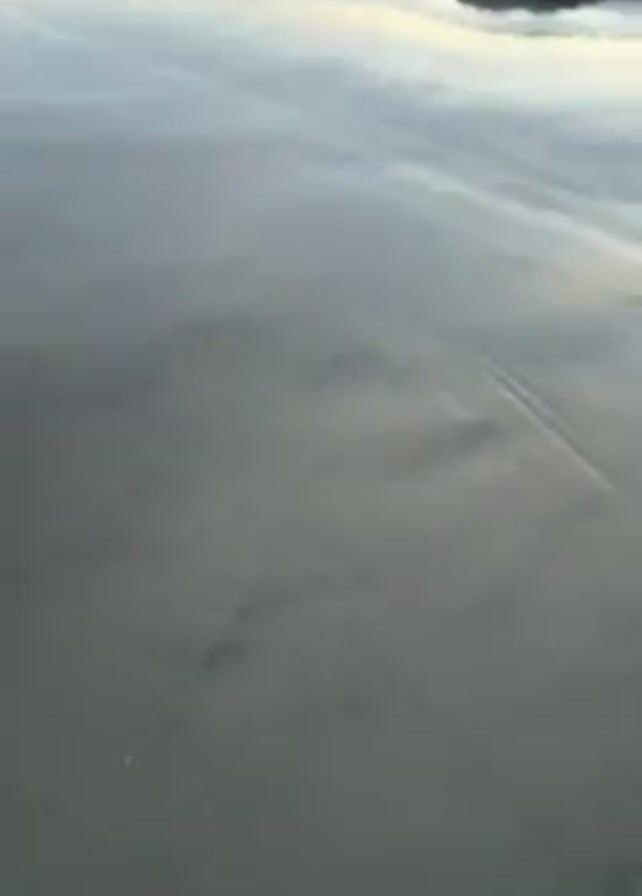 person walking on a sandy beach with rocks, likely at sunset or sunrise due to the warm colors in the sky. The camera follows the person's feet initially, showing the sand and footprints, then pans up to reveal the beach scene. The beach has scattered rocks and shallow water reflecting the sky. In the distance, there are people walking along the shore, trees, and buildings on a bluff. The person recording is wearing a beige jacket and black leggings.