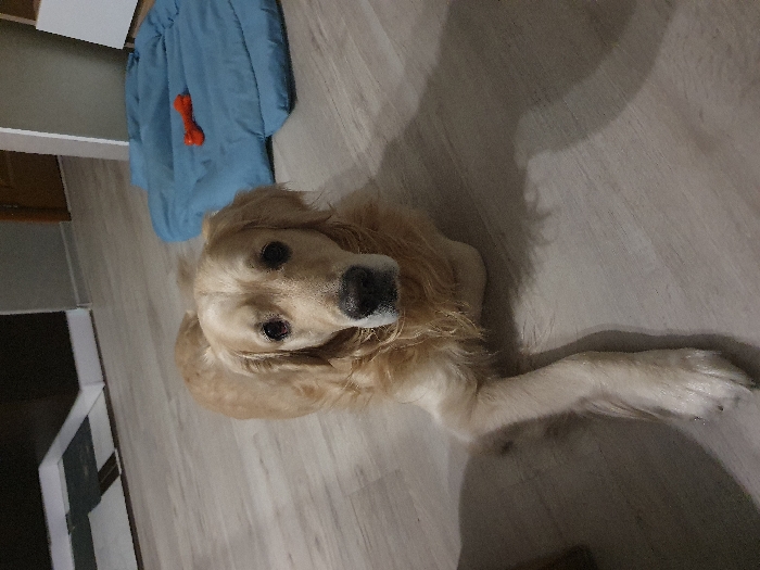 - "A golden retriever lies on a wood-look floor" by FM-HsUWg2, licensed under CC BY 4.0
