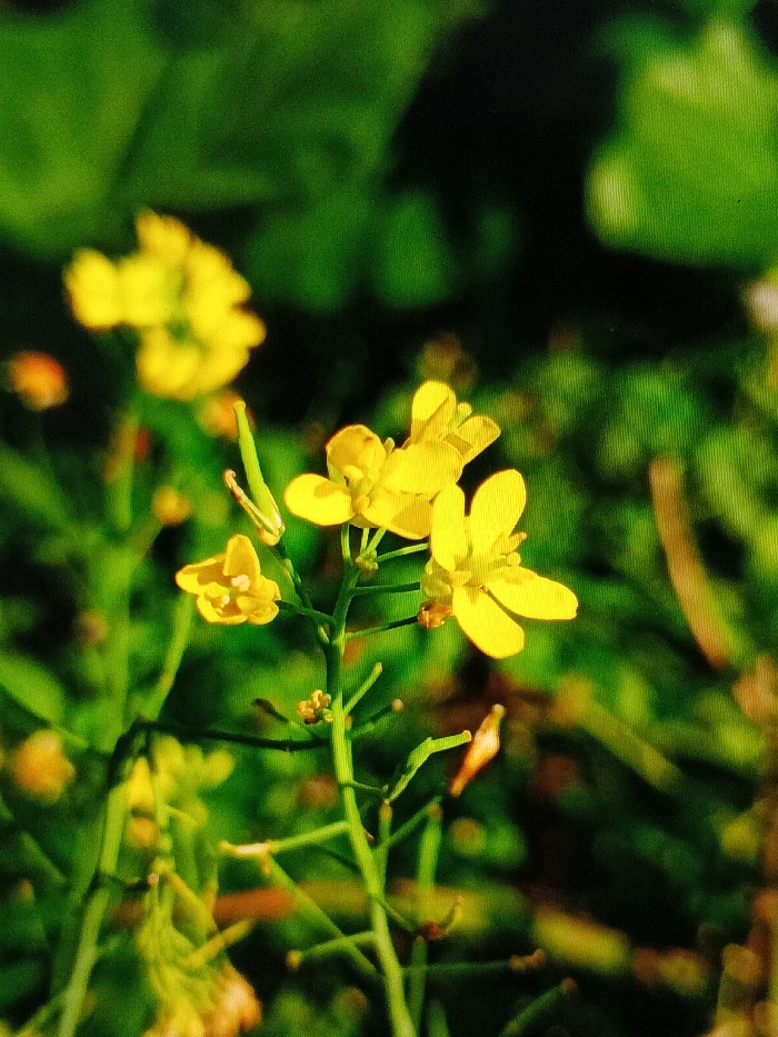 A close-up photograph depicts a flowering plant in the city of Unknown, Unknown. The primary subjects are multiple small, vivid yellow flowers, each exhibiting four petals, clustered on slender green stems. One green, elongated seed pod is visible among the flowers. Smaller yellow buds are also present. The background consists of heavily blurred green foliage, indicating an outdoor, natural setting. Illumination appears to be natural, with the foreground flowers sharply in focus against the diffused green backdrop. No individuals or anthropogenic elements are present.