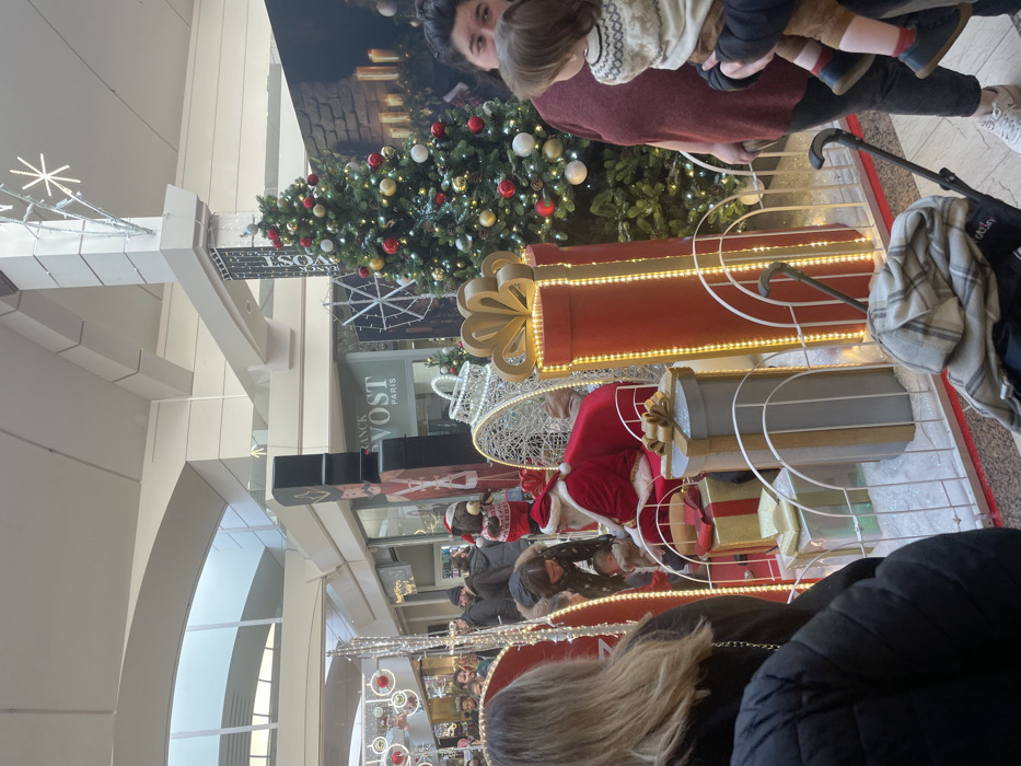 The image displays an indoor Christmas-themed scene within a shopping mall in Mondeville, France