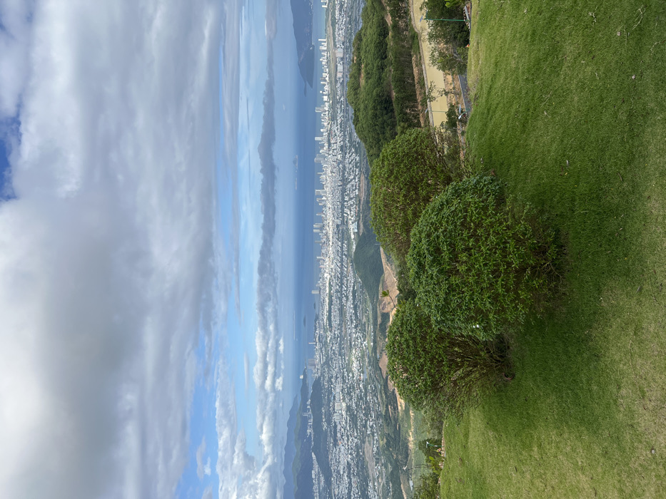 panoramic view from a grassy hill overlooking a city along the coast. The sea divides the city from a sky filled with clouds, blending into the blue sky. There are several green bushes on the edge of the hill, and a path is visible further into the hills. The city appears densely populated, stretching along the coastline.