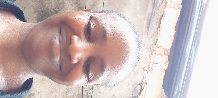A close-up, slightly angled portrait shows a smiling Black woman. Her eyes are partially closed, and her nose is centered. She wears a dark-colored top. The background features an indistinct gray wall and what appears to be a partially open window with white framing. The lighting is somewhat harsh, causing highlights on her face.